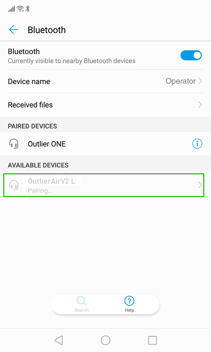 Switch on Bluetooth on your device. Search and pair your device with Outlier Air V2. Tap on the left earbud's name on screen to pair. The right earbud will prompt on your device to pair after.